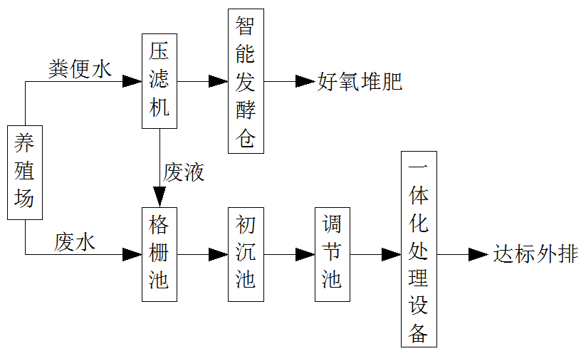養(yǎng)殖場(chǎng)可采用清潔生產(chǎn)工藝,排放的糞便水人工清除至壓濾機(jī)固液分離后進(jìn)入發(fā)酵池,發(fā)酵后作有機(jī)肥。沖洗廢水經(jīng)過(guò)機(jī)械格柵、初沉池初步固液分離,分離出的糞渣并入發(fā)酵倉(cāng),經(jīng)分離后的污水進(jìn)入調(diào)節(jié)池進(jìn)行調(diào)節(jié)水質(zhì)水量,使沼氣發(fā)酵單元穩(wěn)定運(yùn)作。沼氣發(fā)酵池的沼液儲(chǔ)存于沼液存儲(chǔ)池中,進(jìn)行沼液再利用。